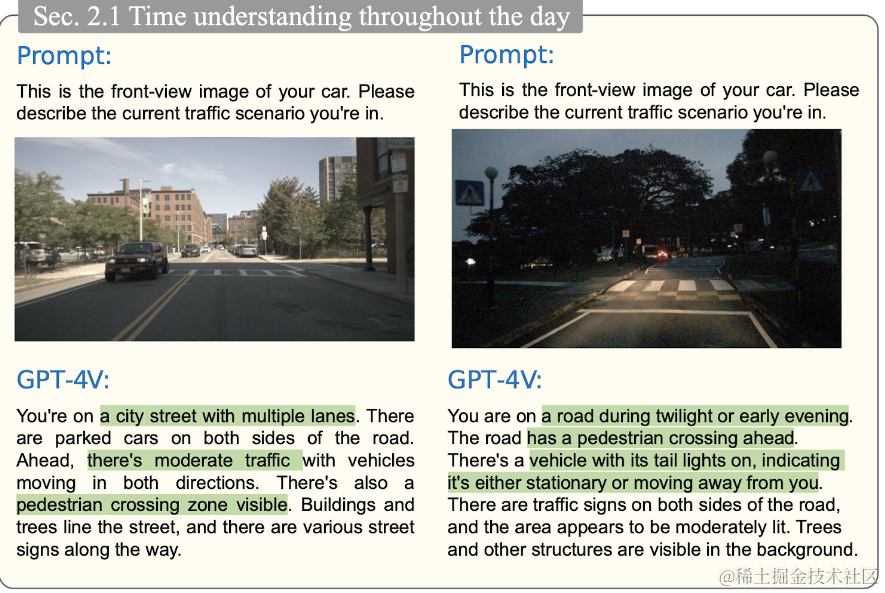 「环境感知」:在此情况下,输入通常是一系列的图像,例如最新的特斯拉取消的激光雷达采用全视觉感知,输出通常是一组对象,例如显示屏中模拟的车道、行人、障碍物等。就大模型而言,其主要有3个核心任务:检测、预测和跟踪。如下图所示,将车辆行驶图像输入到ChatGPT中,可以要求其描述发生的状况: