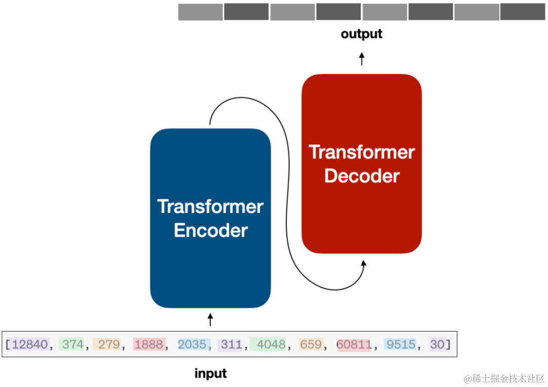 「文本生成」 当上述Token进入Transformer网络中,文本是如何一个一个的生成的呢?如上图,编码器主要是学习输入文本特征并理解上下文,解码器主要是试图生成一个一个的单词,当然在一个一个单词生成的过程中主要依赖概率来进行判断输出。如下图所示: