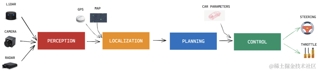 那么,汽车的自动驾驶是否也有可能出现类似的事情呢?前几年的汽车自动驾驶大多都是基于所谓的“模块化”构建,其主要包括感知模块、定位模块、规划模块、控制模块等,这里的控制模块会根据其他模块的信息来实现汽车的转向、变道等功能。如下图所示: