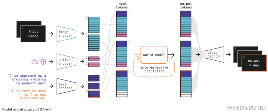「图像生成」 您听说过 Wayve 的 GAIA-1 模型吗?该架构将图像、动作和文本提示作为输入,然后使用世界模型(对世界及其交互的理解)来生成视频,其模型架构如下所示: