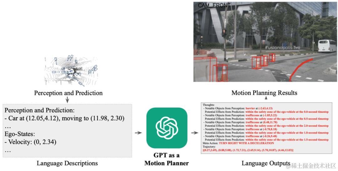 其他模型(例如 DriveGPT)经过训练,将 Perception 的输出发送到 Chat-GPT 并对其进行微调,以直接输出驾驶轨迹。如下图所示: