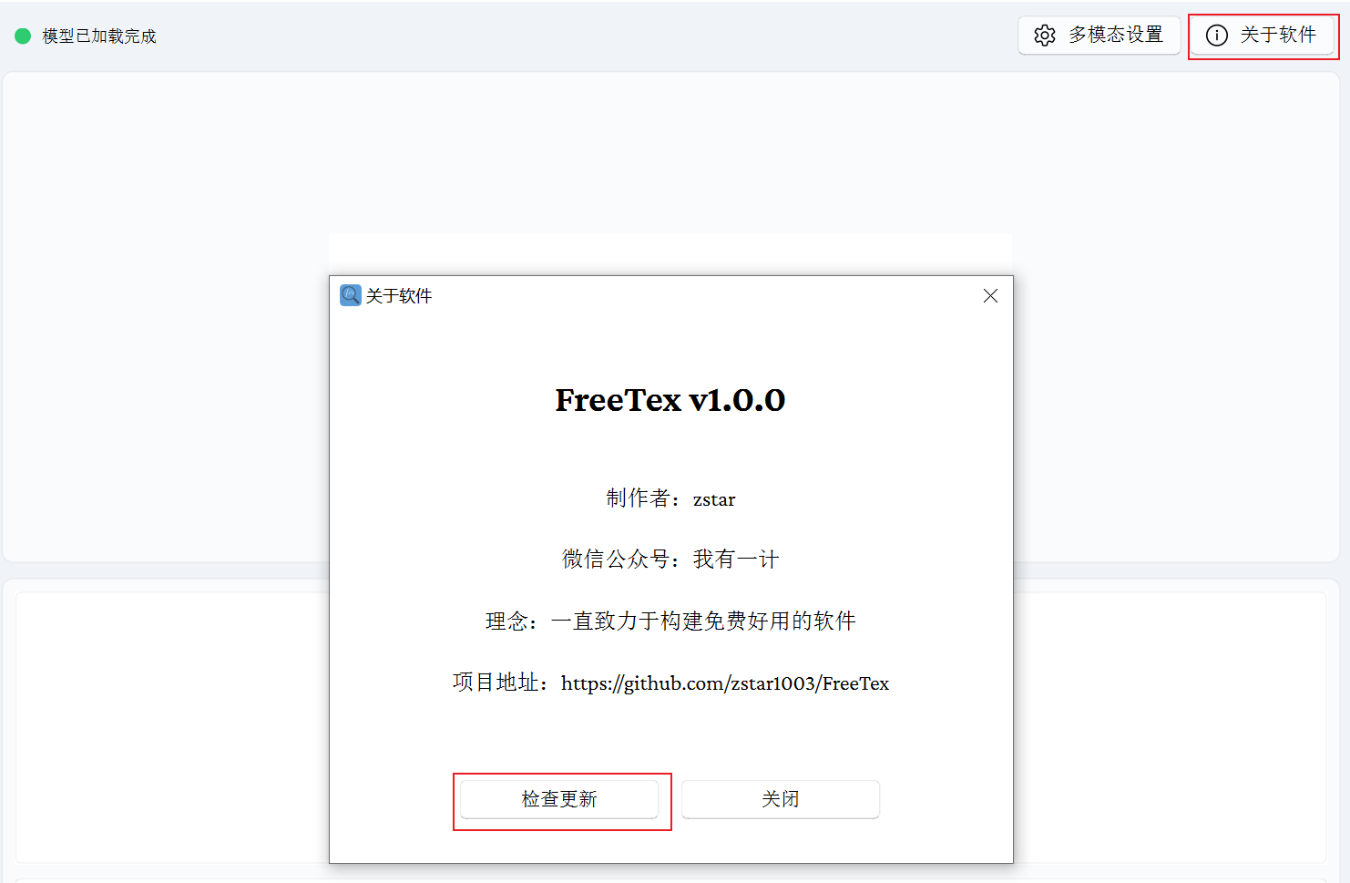 点击关于软件按钮,会出现软件信息弹窗,可点击检查更新,自动去 github 上查询最新版本,方便更新下载。