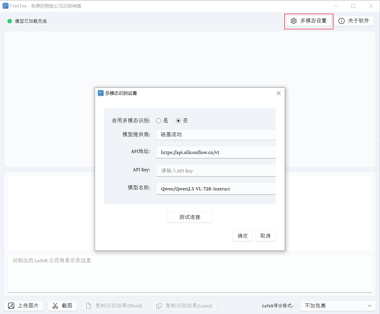填入自己的API-Key,设置好模型后,点击测试连接,可以快速测试是否能连通。