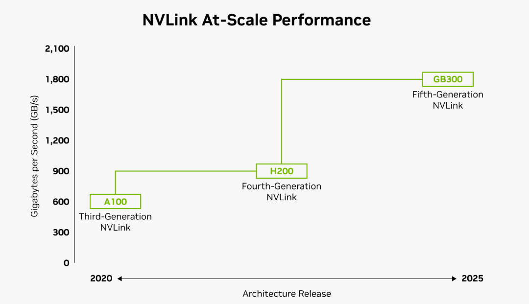 NVLink是加速系统中GPU和CPU处理器的高速互连技术,如今第四代NVLink连接主机和加速处理器的速度高达每秒900GB/s,这是传统x86服务器的互连通道——PCIe 5.0带宽的7倍多。