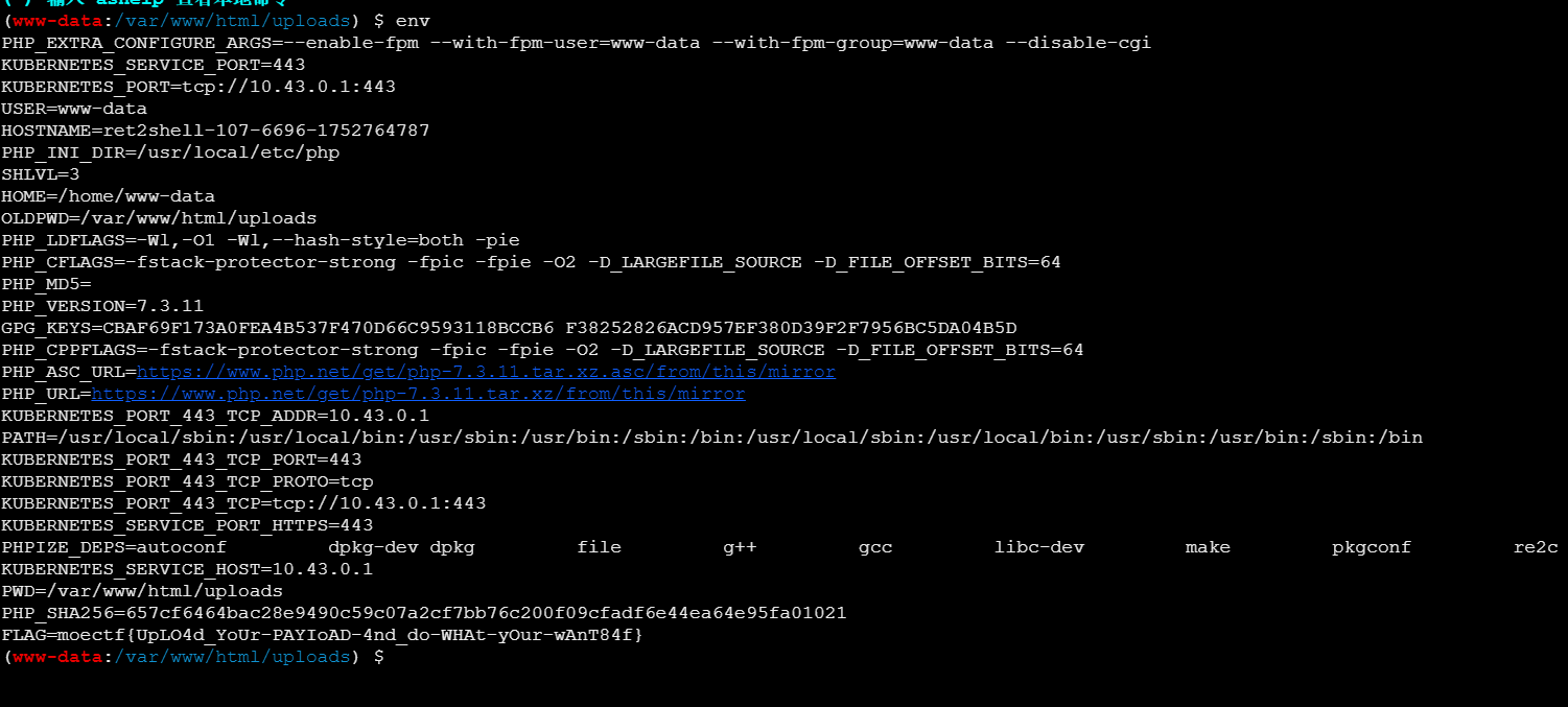 这题传个一句话木马,再用蚁剑来连一下没啥好说的。进入终端查看环境变量,flag果然在里面。唯一一个有点像的并不是flag存放位置。这个时候就要用到垫刀1的启示,但是蚁剑连上了找不到flag。
