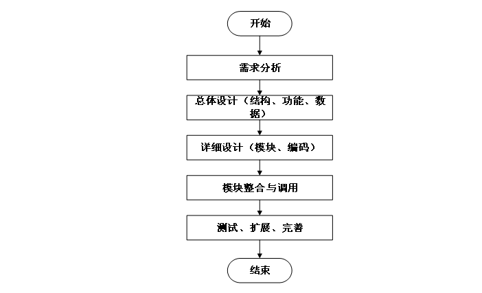 系统开发流程的主要步骤,从需求分析到系统完成的全过程。流程包括需求分析、总体设计(结构、功能、数据)、详细设计(模块、编码)、模块整合与调用,以及测试、扩展和完善,最终完成系统的开发。本系统的开发流程如下图所示
