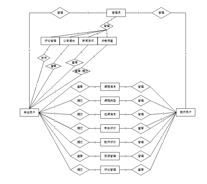 本系统的设计与实现包括三个主要用户角色:管理员、学生用户和教师用户。管理员可对系统中的课程信息、课程类型、选课信息、作业信息、考试成绩以及学生和教师评价进行全面管理。学生用户则可查看个人选课信息、作业成绩、考试成绩等,并参与问卷调查、查看课程公告和新闻资讯等功能。教师用户则可以管理课程信息、选课情况、作业和成绩等内容,同时参与教师评价和学生评价管理。....