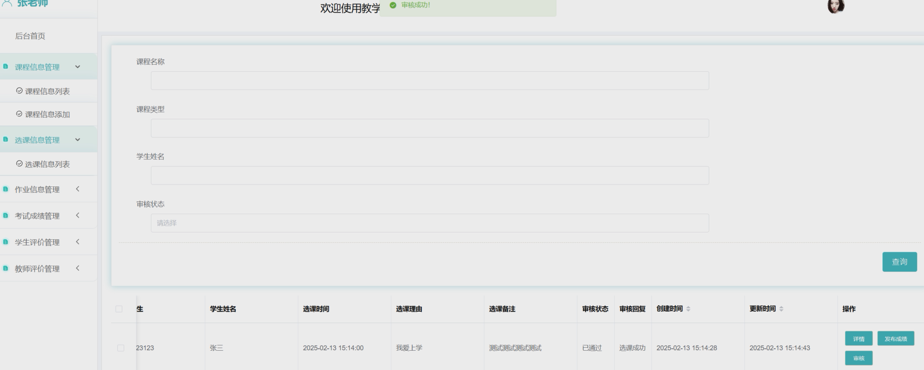教师用户在这里可以对学生的选课信息进行查看、审核等操作。如下图所示