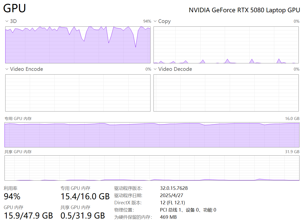 RTX 5080显卡,16GB显存,几乎已经占满了。内存,大概用了30G左右