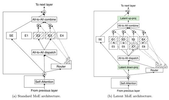 图 3:标准 MoE 与潜在 MoE 架构对比。在潜在 MoE 中,token 被投影至更小的潜在维度进行专家路由与计算,在降低通信成本的同时支持更多专家参与,并提高每字节精度。