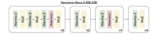 图 1:Nemotron 3 混合架构。该模型通过交错部署 Mamba-2 与 MoE 层,辅以少量自注意力层,在保持领先精度的同时实现推理吞吐量最大化。